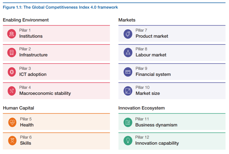 The GCI allows for assessing progress against an array of factors determining productivity. These are organized into 12 pillars: Institutions; Infrastructure; ICT adoption; Macroeconomic stability; Health; Skills; Product market; Labour market; Financial system; Market size; Business dynamism; and Innovation capability.