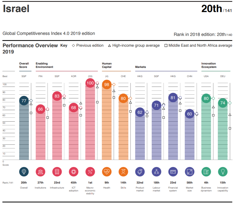 Israel is a top performer in several areas within the ‘Innovation Capability’ and ‘Business Dynamism’ pillars. In specific, Israel is leading the rankings in ‘Entrepreneurial Culture’ / ‘Growth of Innovative Companies’ / ‘Companies Embracing Disruptive Ideas’. This comes as no surprise for the Start-Up Nation.
